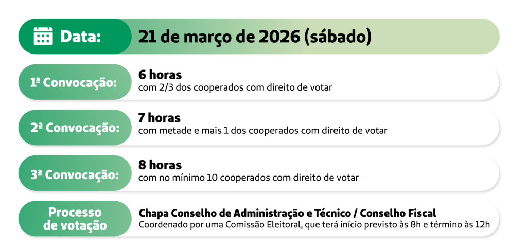 O Balanço Geral e os livros contábeis estarão à disposição dos cooperados a partir do dia 19 de fevereiro de 2026, na sede II da Unimed Campinas – na Área de Gestão de Relacionamento com Cooperados, situada à Av. Barão de Itapura, 1128 – Guanabara, Campinas – SP, nos dias úteis, durante o horário comercial (artigo 13, inciso IV do Estatuto Social);